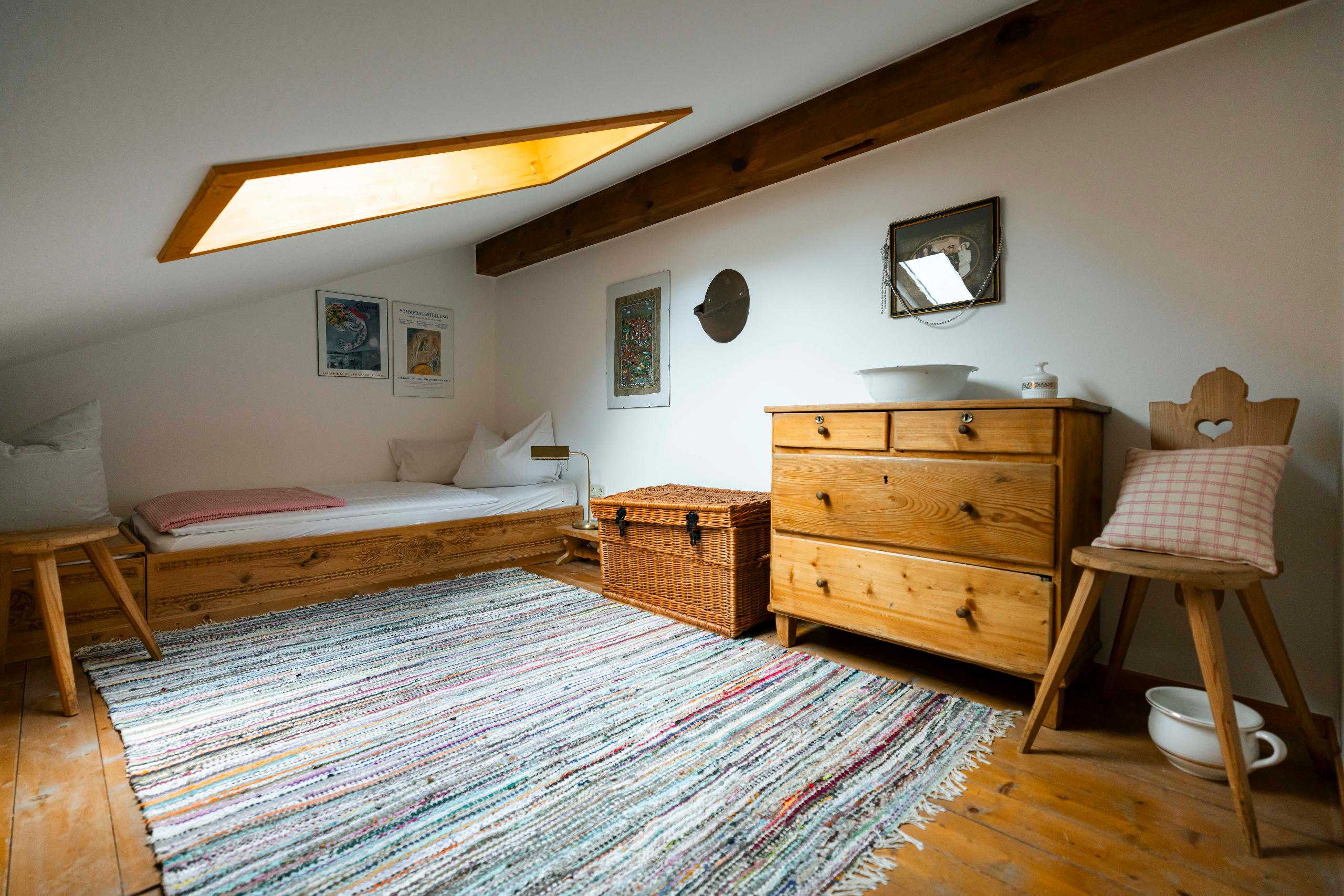 Ein separates Schlafzimmer mit Doppelbett, sowie zusätzliche Schlafmöglichkeiten (1 Einzelbett und 1 Zustellbett) für weitere Personen im Galeriebereich.