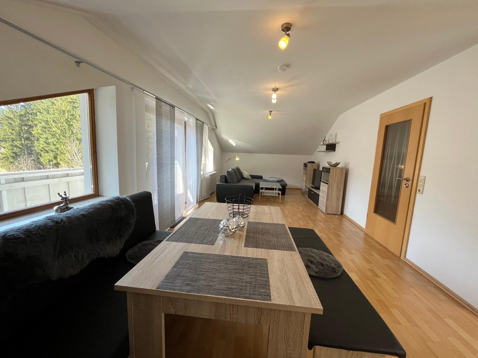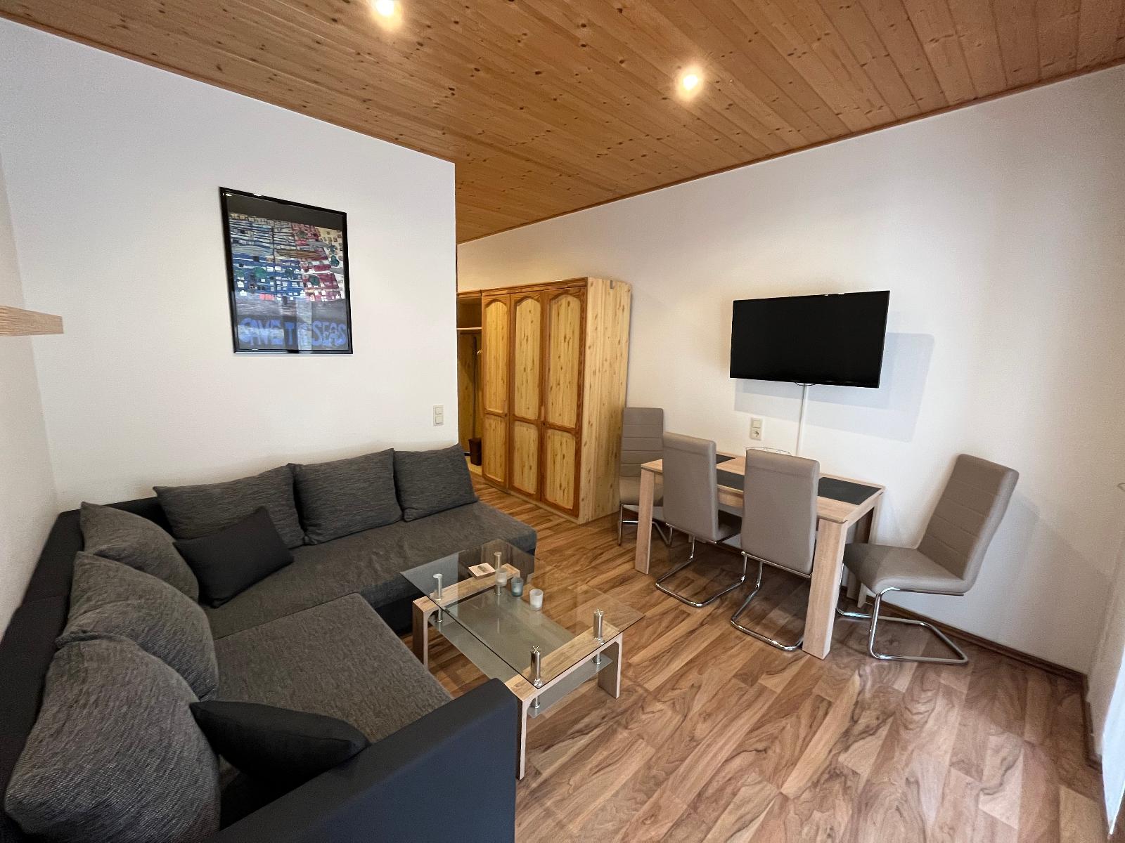 Neben einem Schlafzimmer mit einem Doppelbett und einem Schlafraum mit zwei Einzelbetten verfügt die Ferienwohnung über einen modern eingerichteten Wohnbereich mit Full-HD-Fernseher (99 cm Durchmesser), Couch, Esstisch mit Eckbank und zwei Stühlen.