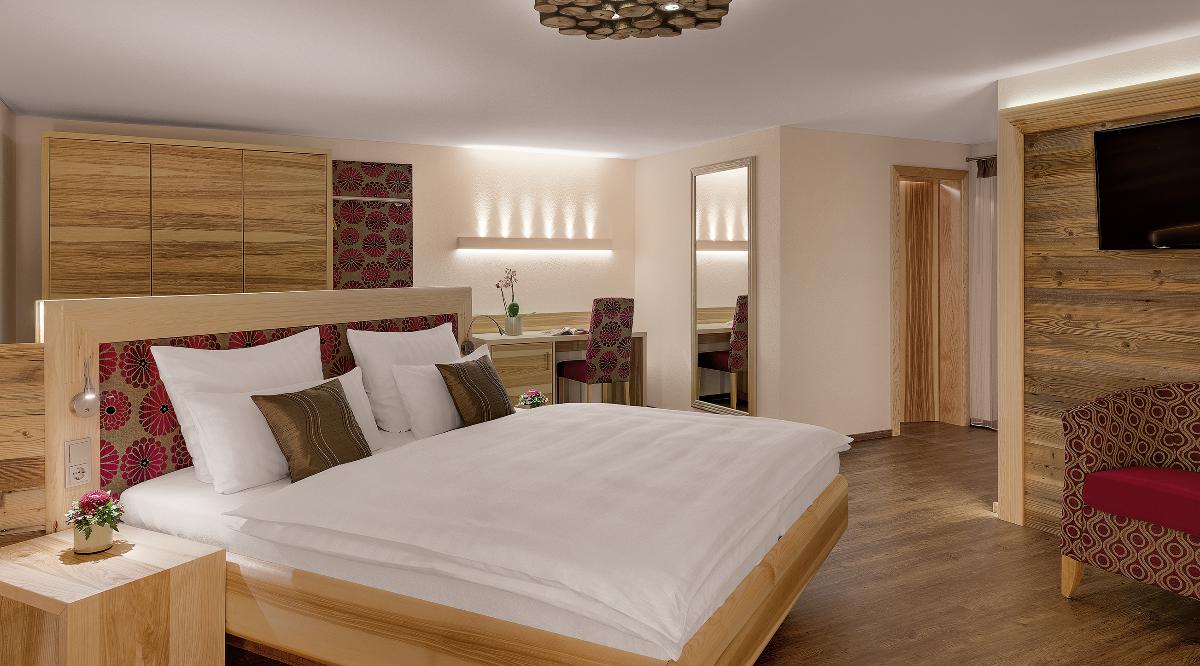 Die Suite ist hell und großzügig geschnitten in modernem Design eingerichtet (Vinylboden und Fußbodenheizung) mit 2 Balkonen (West- und Südseite) und sehr schöner Aussicht auf die umliegenden Berge, Sitzecke mit bequemen Clubsesseln einem schwenkbaren Flat-TV, Schreibtisch und Safe.